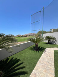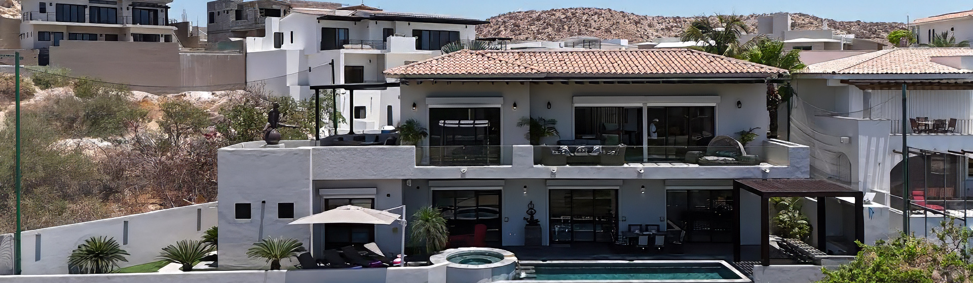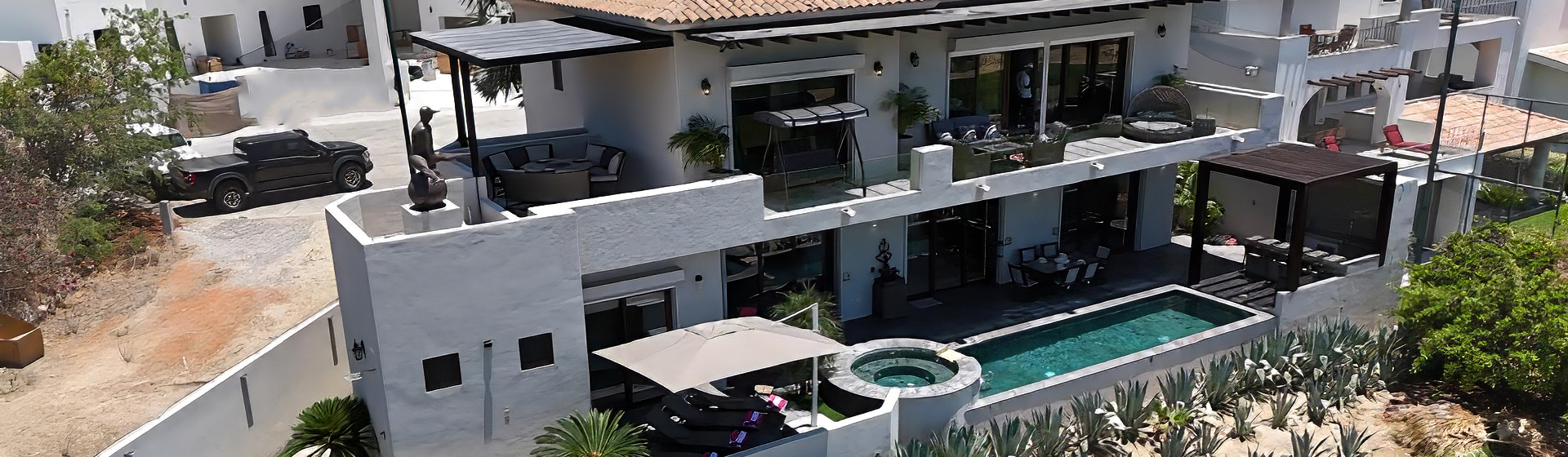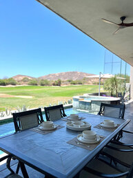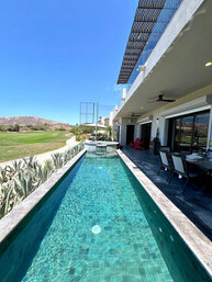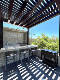 - Terraza con alberca, asador, mesa y camastros.